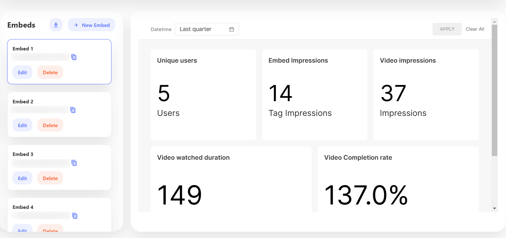 Once you create an embed, it will be listed in the Embed List. This section provides a central location where you can easily access and manage all of your existing embeds. Within the Embed List, you can monitor key performance metrics to gain insights into how your content is performing. These metrics include: