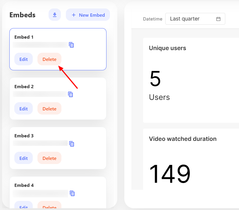 If you need to remove an embed, simply click the Delete button. This will permanently remove the embed from both your list and your website.