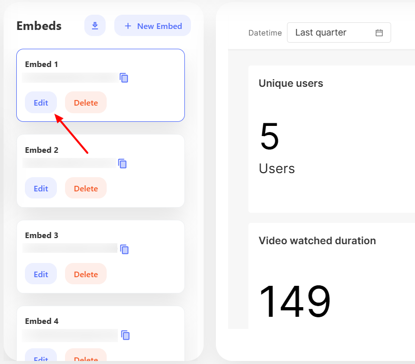 To make changes to an embed, click the Edit button. This allows you to update settings, customize styles, or adjust content as needed.