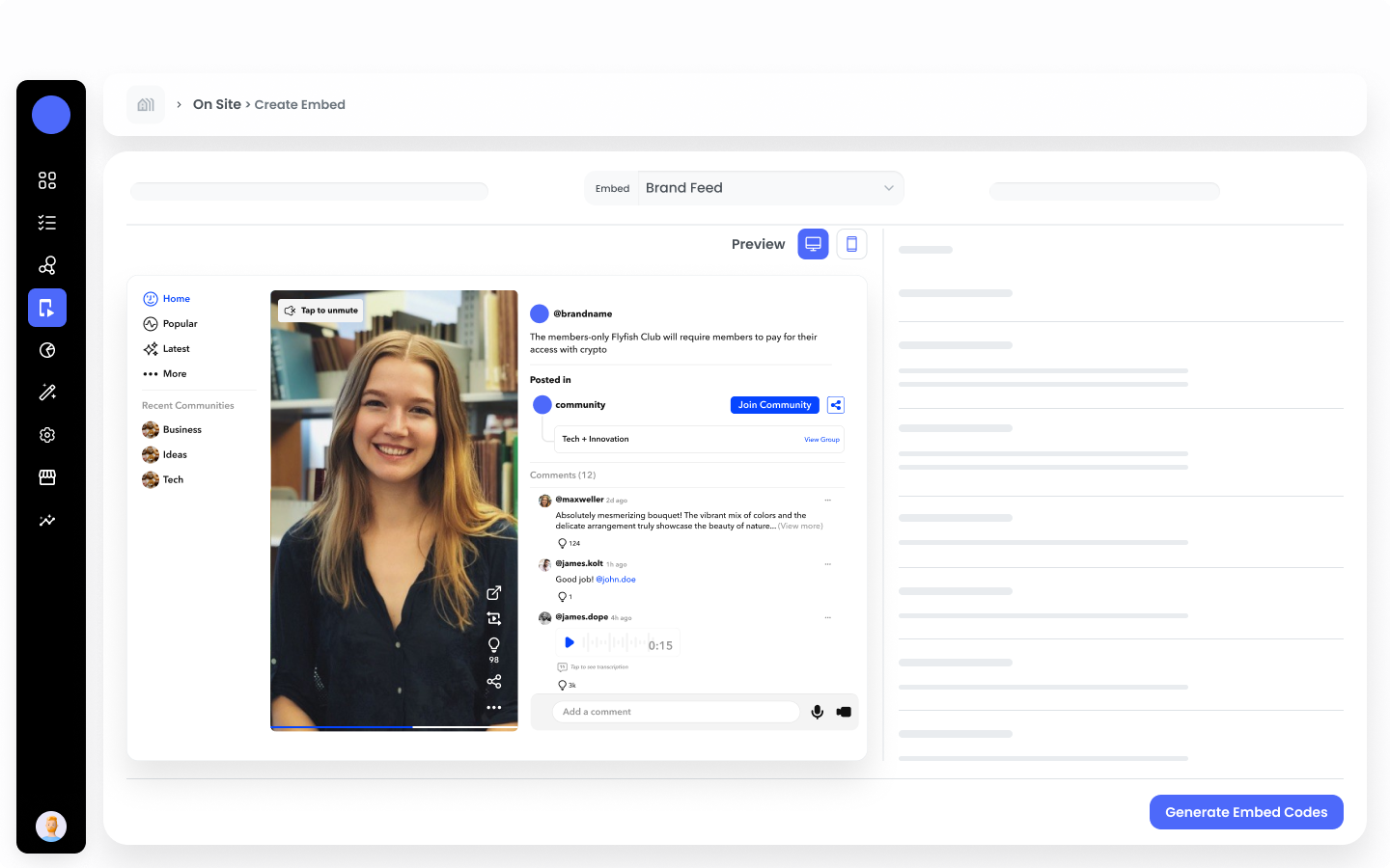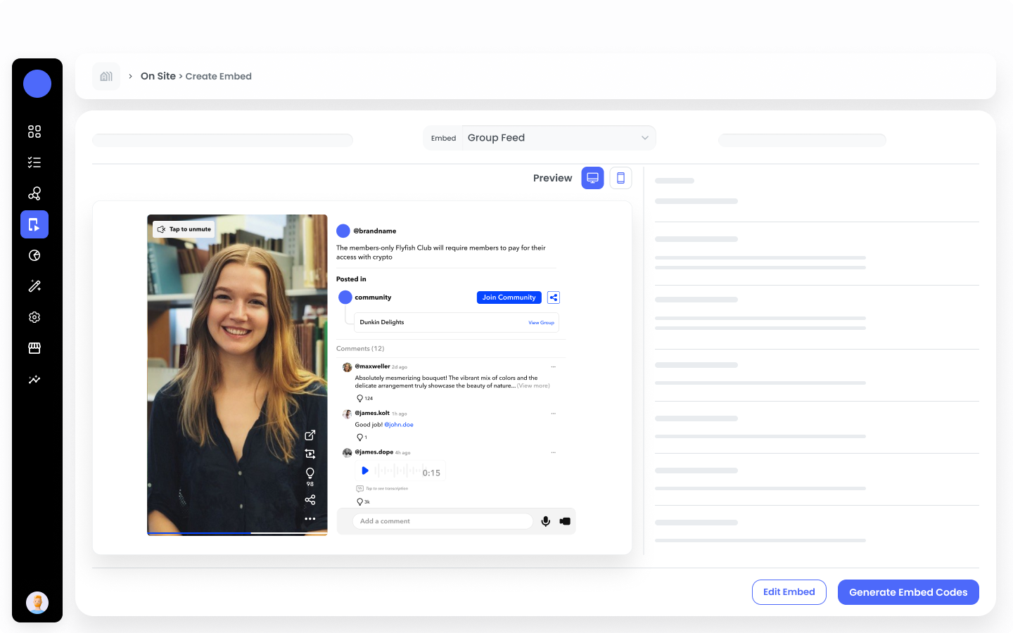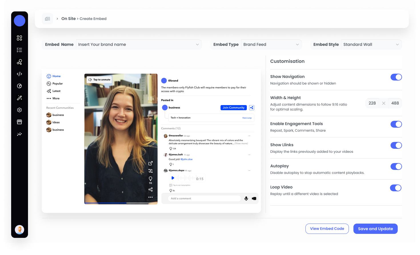 SettingsEmbed Size: Specify the width and height for the embed to ensure it fits perfectly within your website’s layout.Show Navigation: Choose whether to include navigation controls.Enable Engagement Tools: Enable this to display the Repost, Spart, Comment, and Share.Show Links: Enable this option if you want to make linkouts visible.Group Video: Enable this feature to auto play the video.
