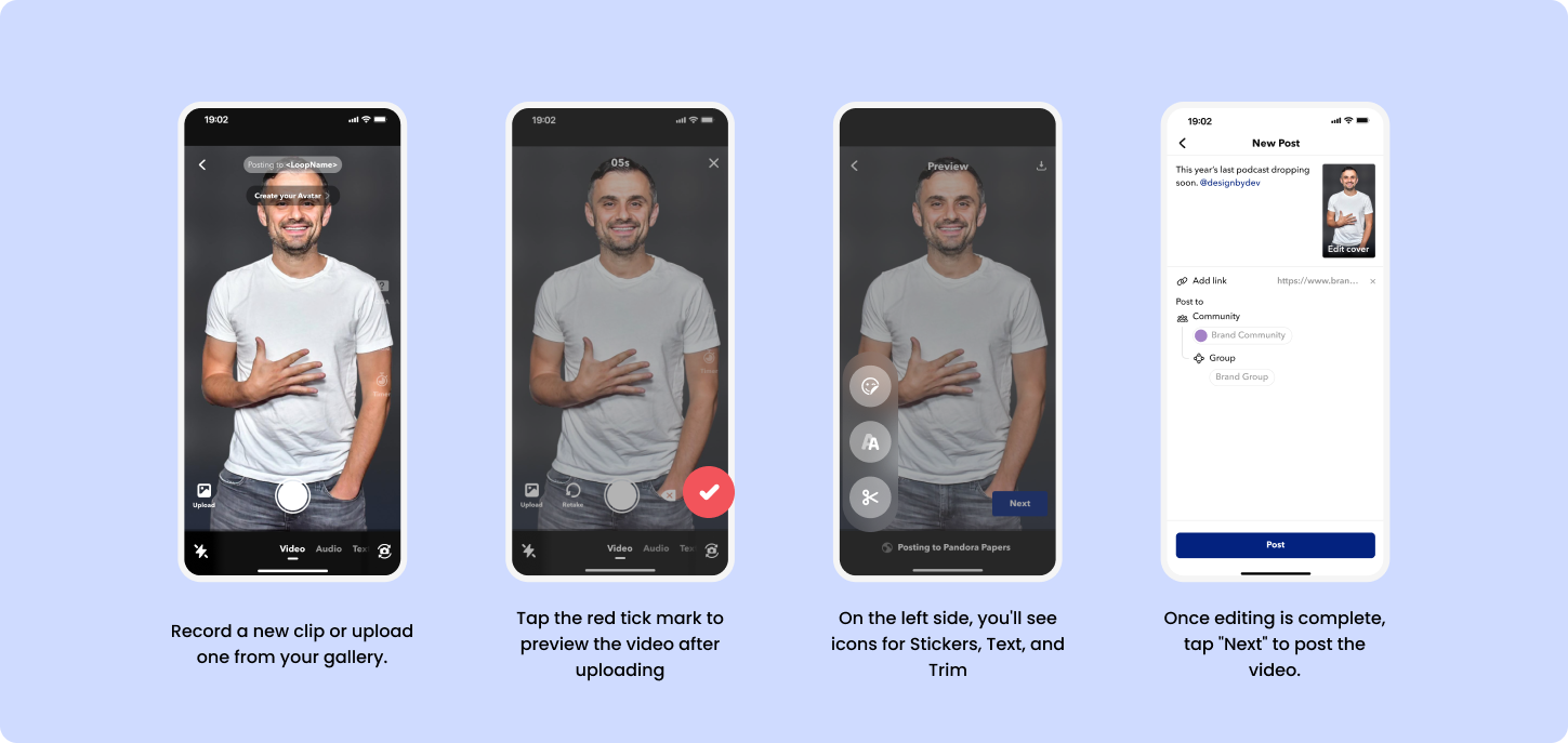 - Once editing is complete, tap “Next” to post the video.