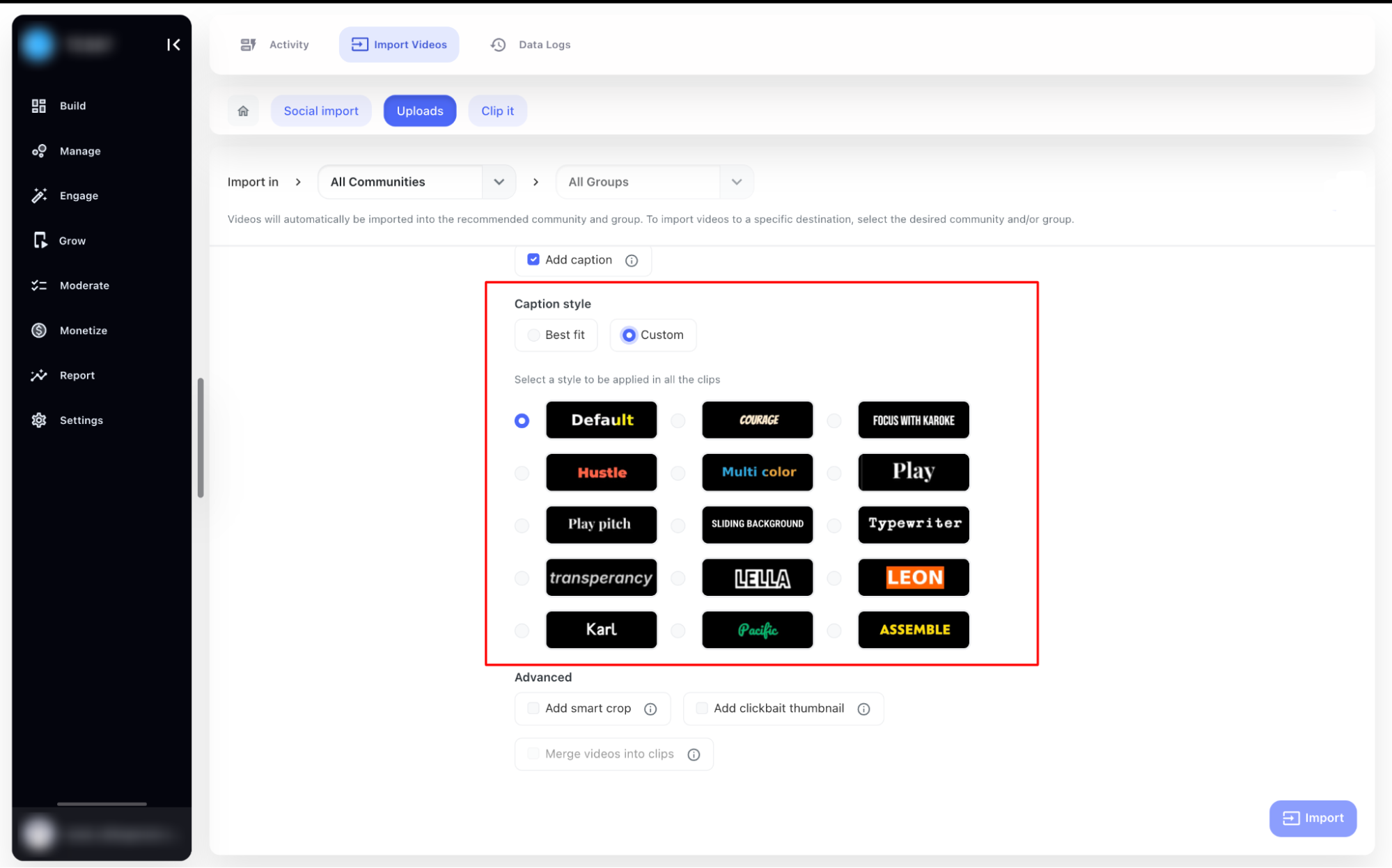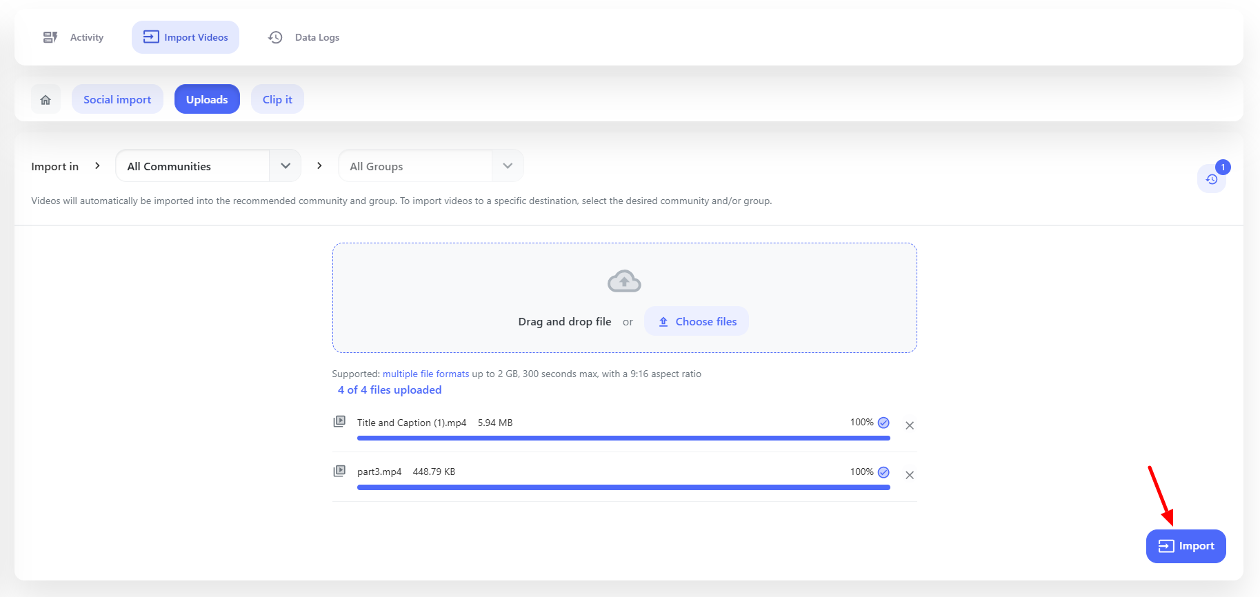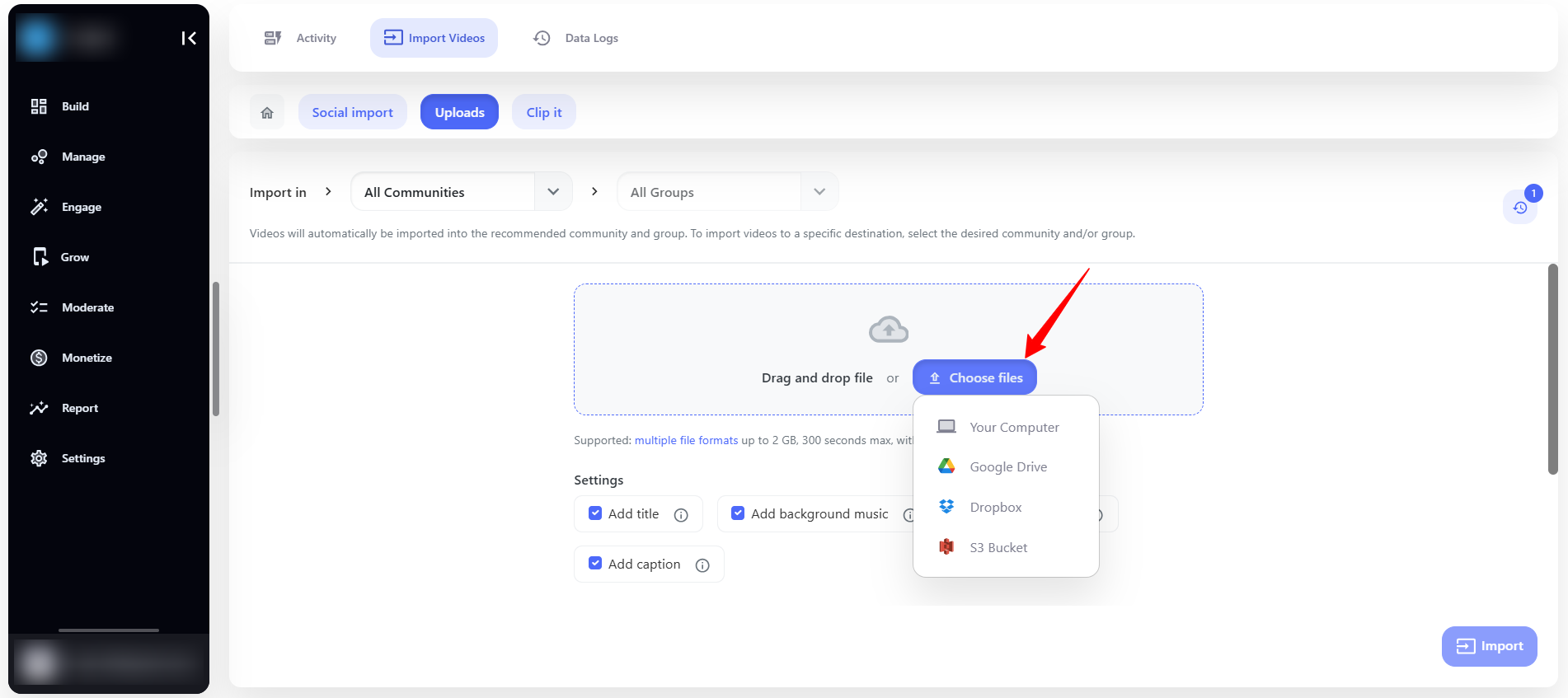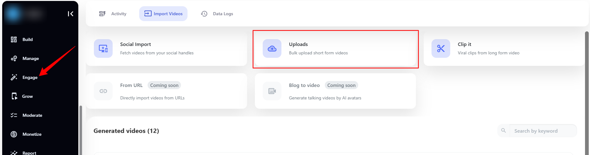 Navigate to Engage > Import Videos > Uploads, you can upload the videos to post it. To upload the Video you can, drag and drop the videos or upload it from the Computer, Google Drive, Dropbox, and S3 Bucket.
