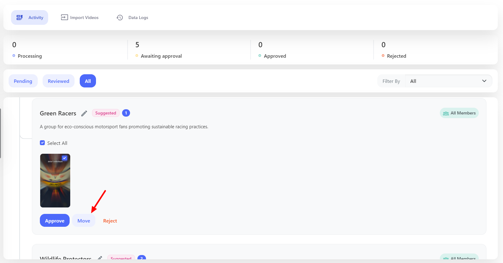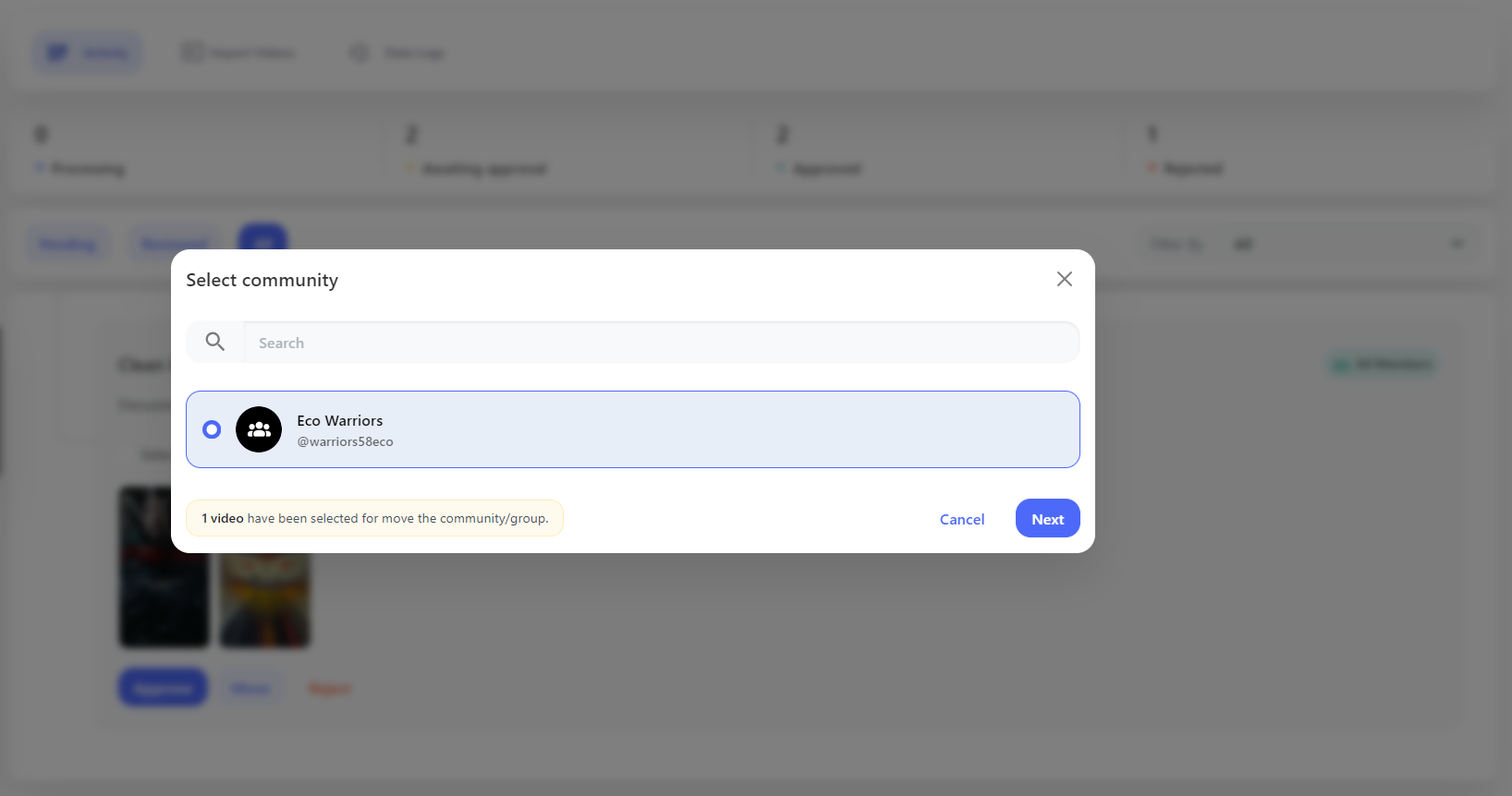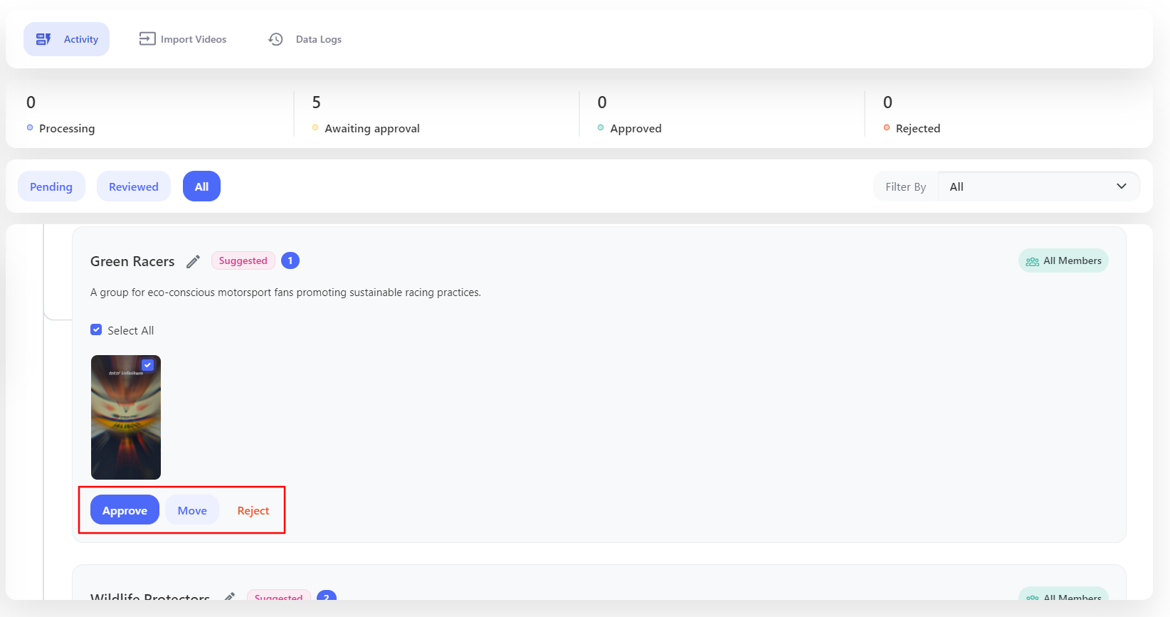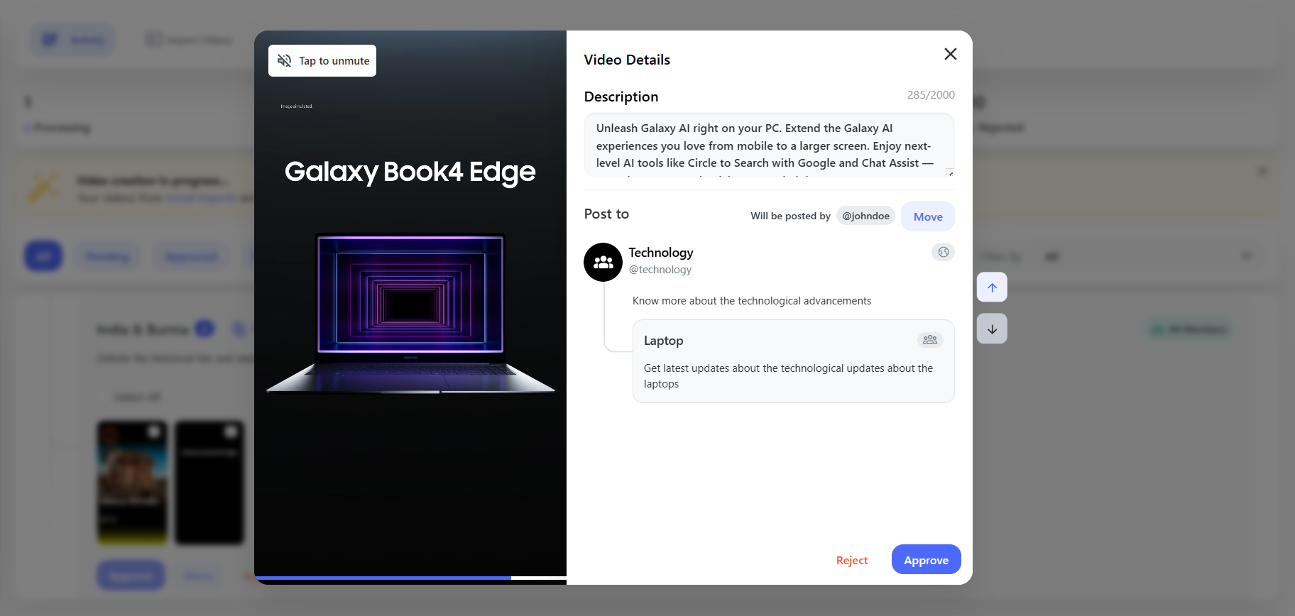 Based on the content of Video, you can view the suggested Community and Group name. Within the Group name your uploaded video will be visible. You can select the video and Approve it to post it or you can Reject it if you don’t like the video.