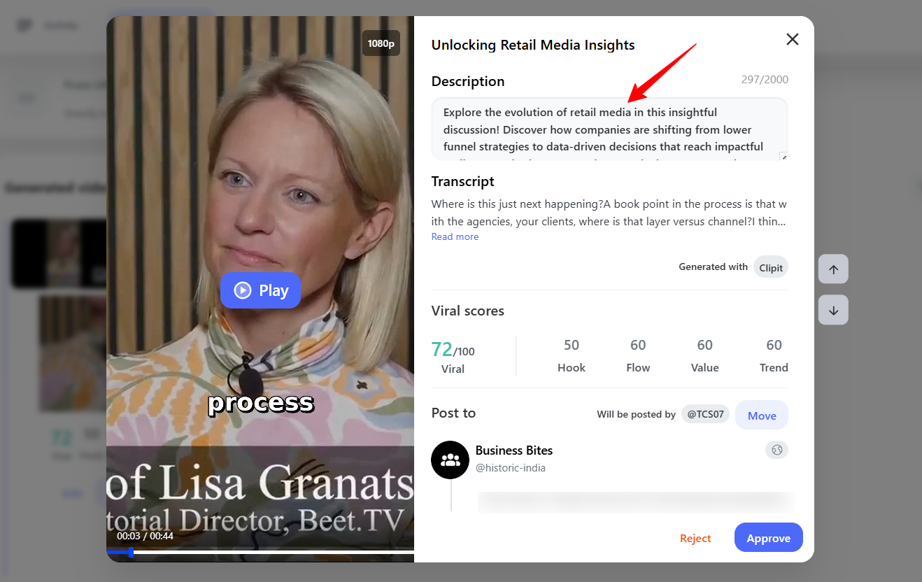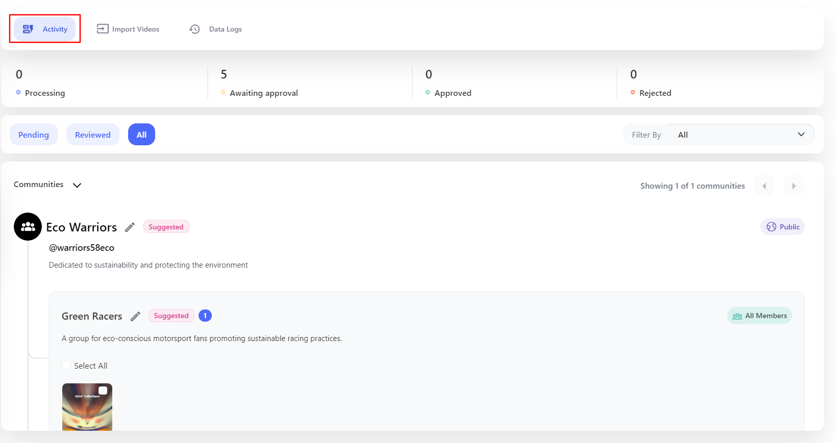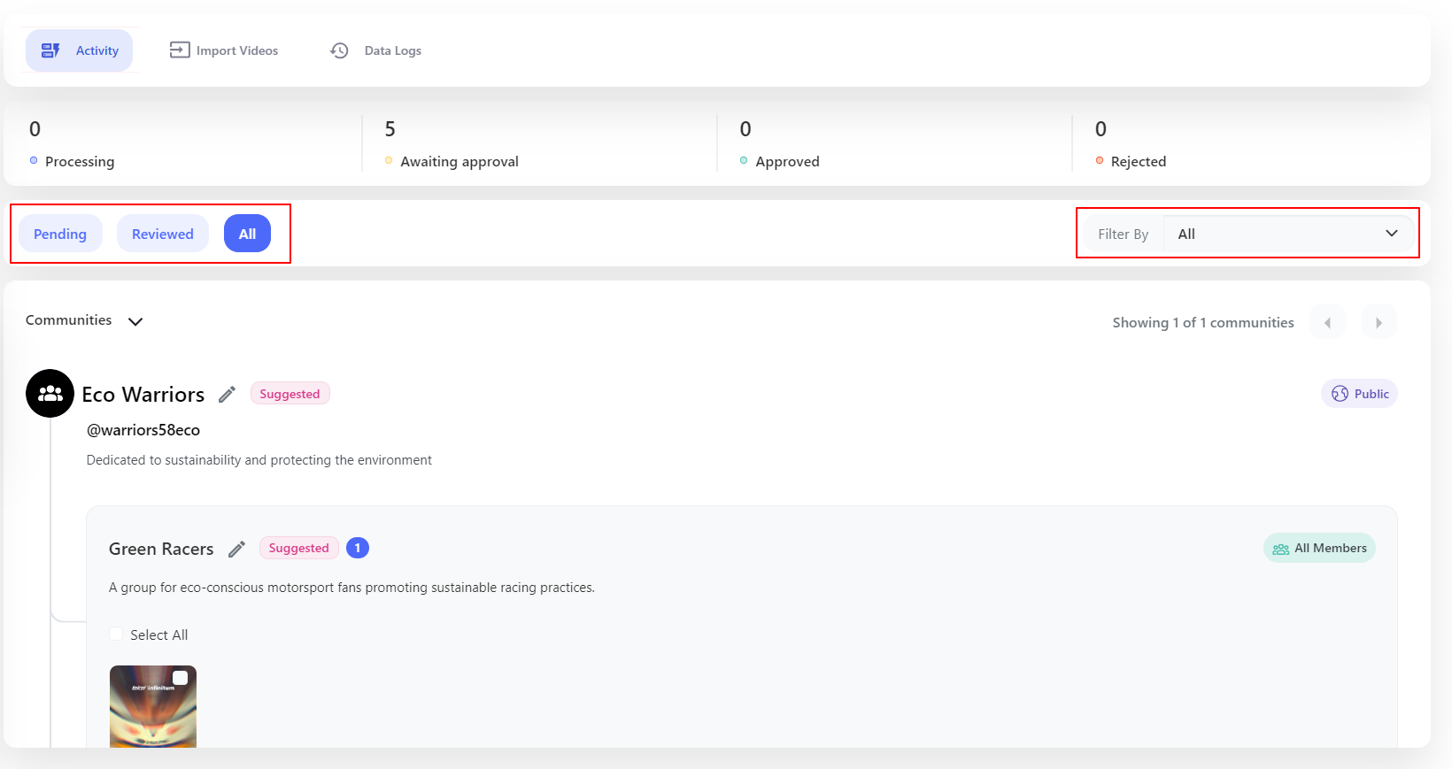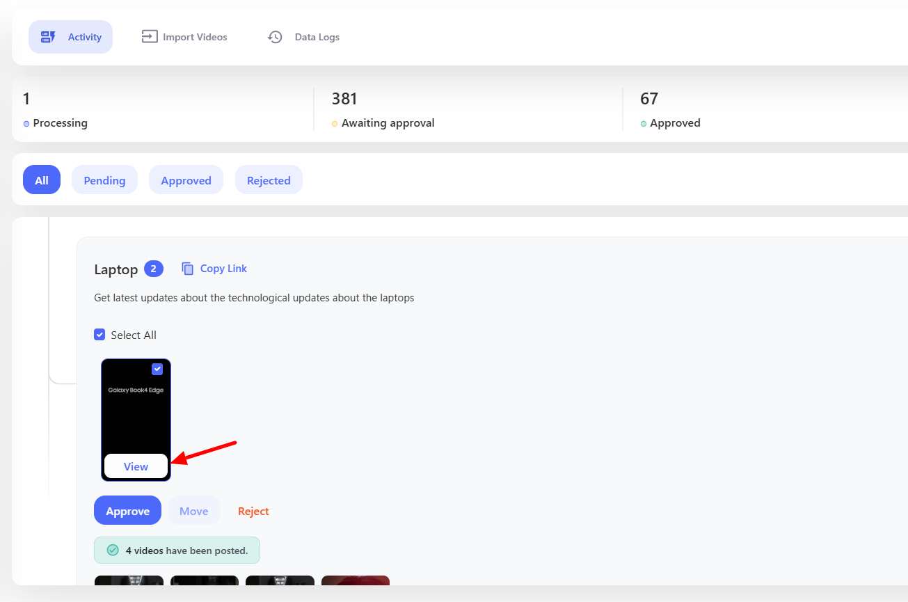 Based on the content of Video, you can view the suggested Community and Group name. Within the Group name your uploaded video will be visible. You can select the video and Approve it to post it or you can Reject it if you don’t like the video.