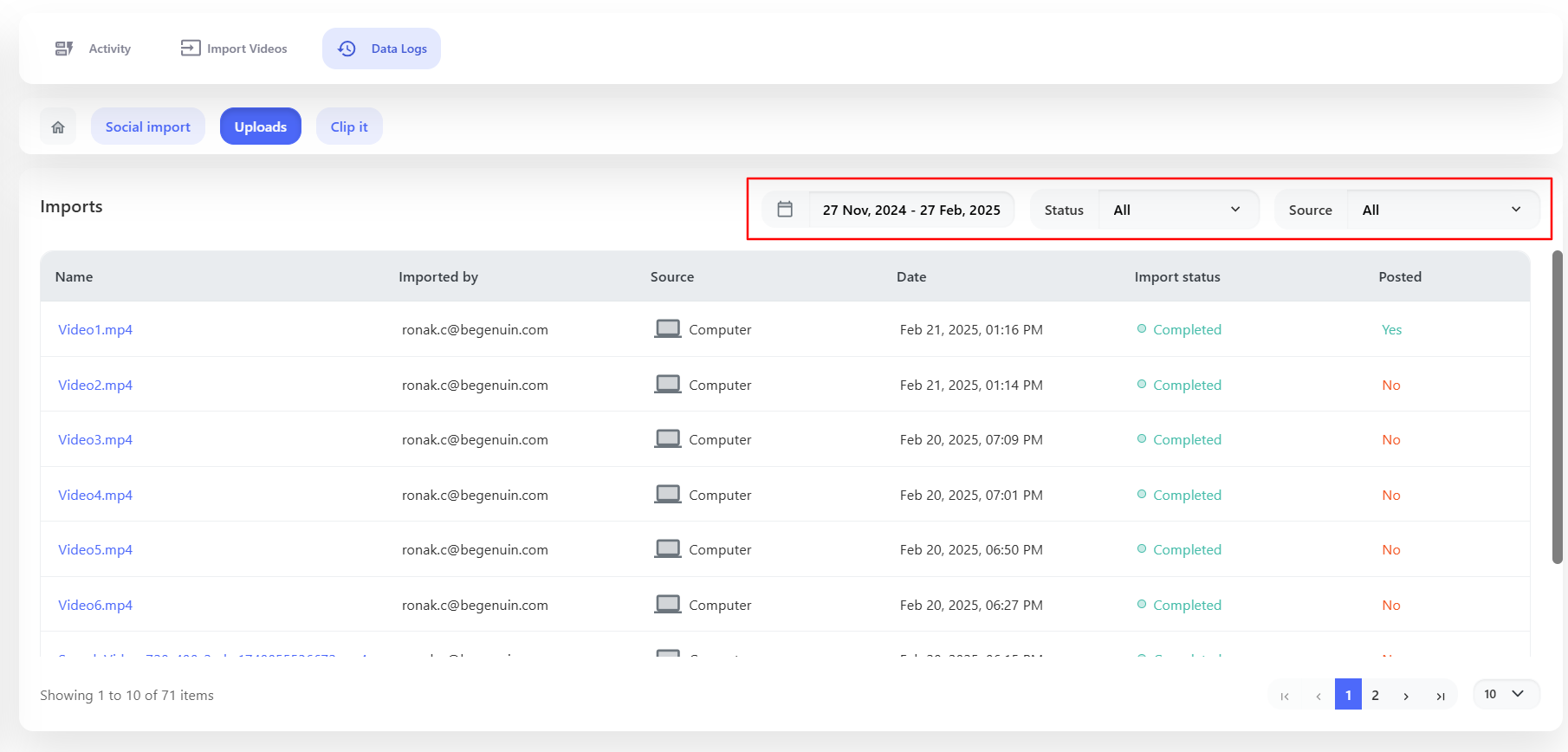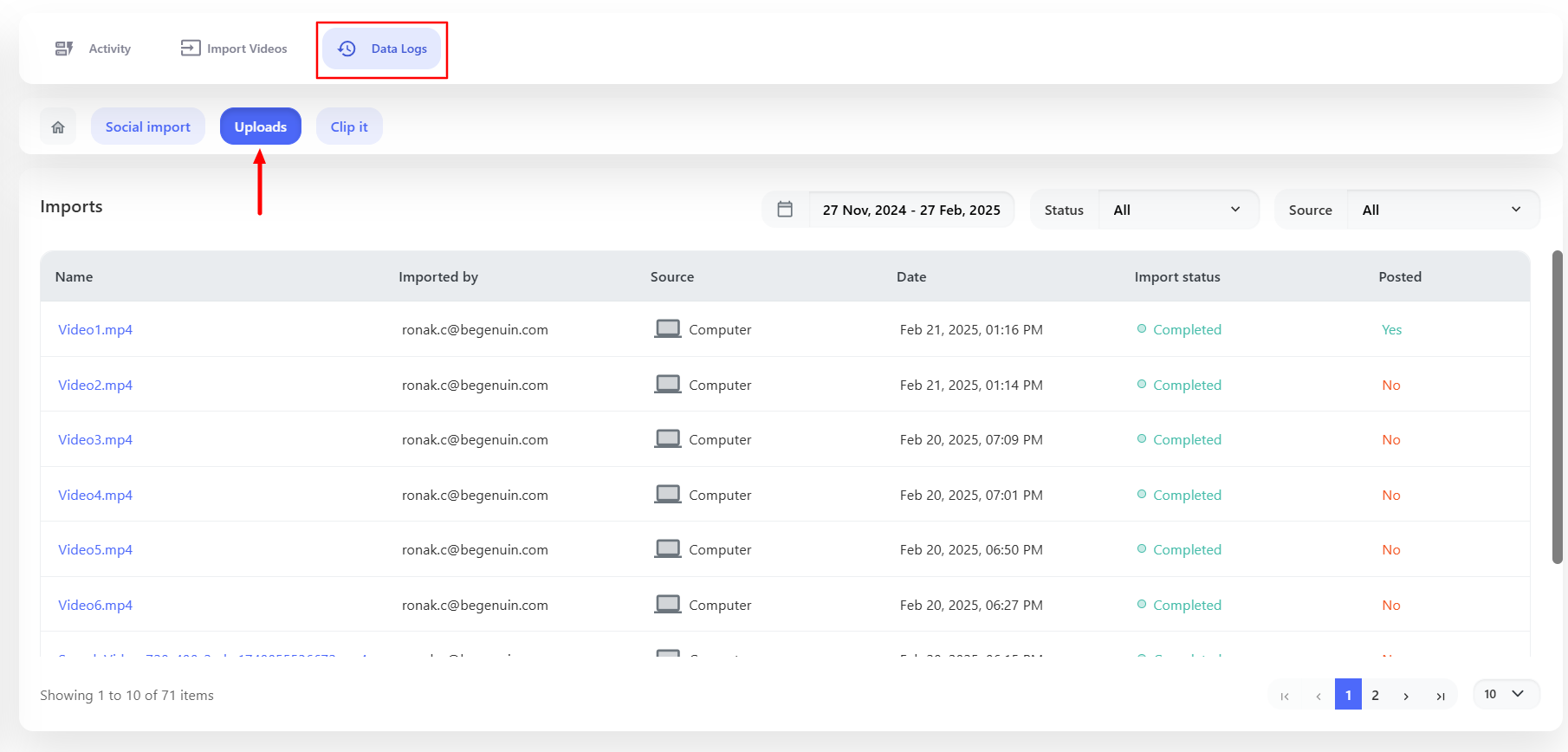 You can see the import status from the Data Logs > Uploads and other details like Name, Date, Import Status and Posted (Yes/No).